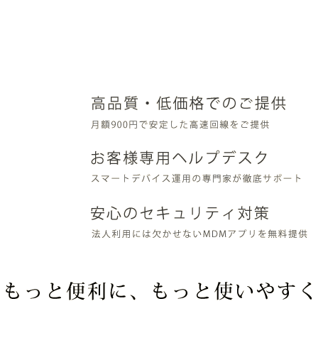 月額990円でNTTドコモの「Xi」エリア及びFOMAエリア、au・ソフトバンクの 4G LTE回線に対応している高速データ通信回線を提供することにより、格安SIMでスマホやタブレットにかかる経費を削減、コストダウンにつなげます。